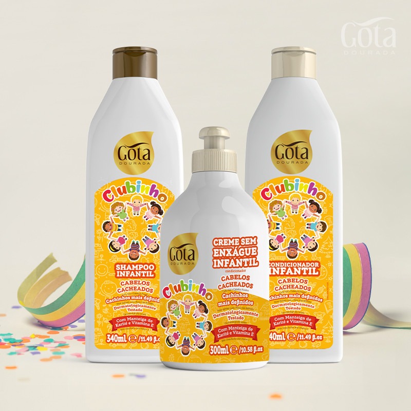 O condicionador da Gota Dourada da linha Clubinho é dermatologicamente testado e pode ser utilizado em crianças a partir de 1 ano de idade. Foi especialmente desenvolvido para proteger os fios contra as agressões externas, facilitar o desembaraçar e deixar o cabelo suave, leve e com os caracóis definidos.
